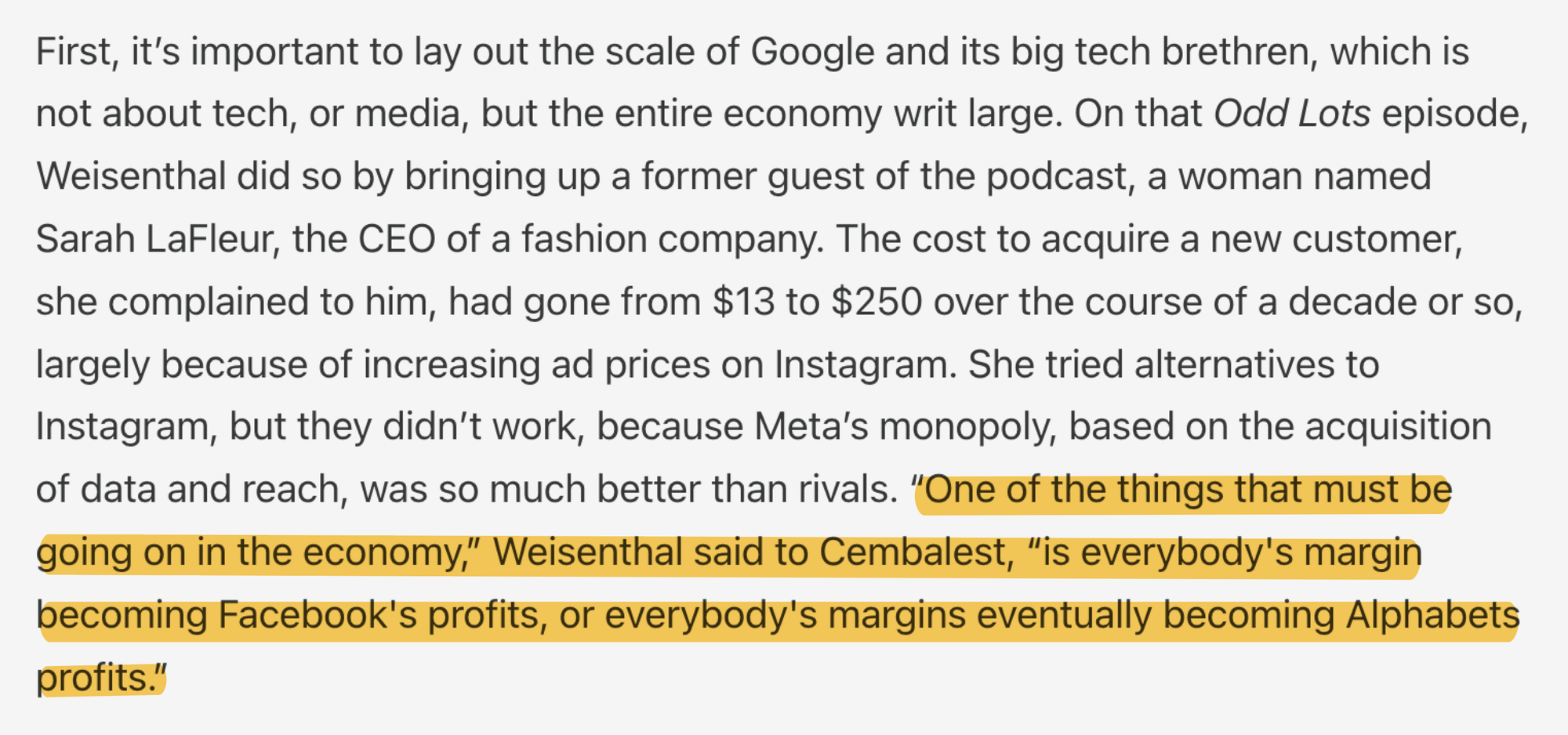 What Doctorow specified in his original essay, which sometimes gets lost in the mix as the term gains further purchase, is that enshittification is explicitly downstream of monopolization. The former is a function of the latter. In short, shopping on Amazon sucks because Amazon has choked its competition out of business while building a vertically integrated retail fortress in which sellers are forced to buy ads on Amazon's own platform in a desperate bid for customer visibility—simultaneously reinforcing Amazon's bottom line while driving consumer prices upward. Truly, the monopoly power that Silicon Valley wields is breathtaking, making the days of Standard Oil seem quaint in hindsight.