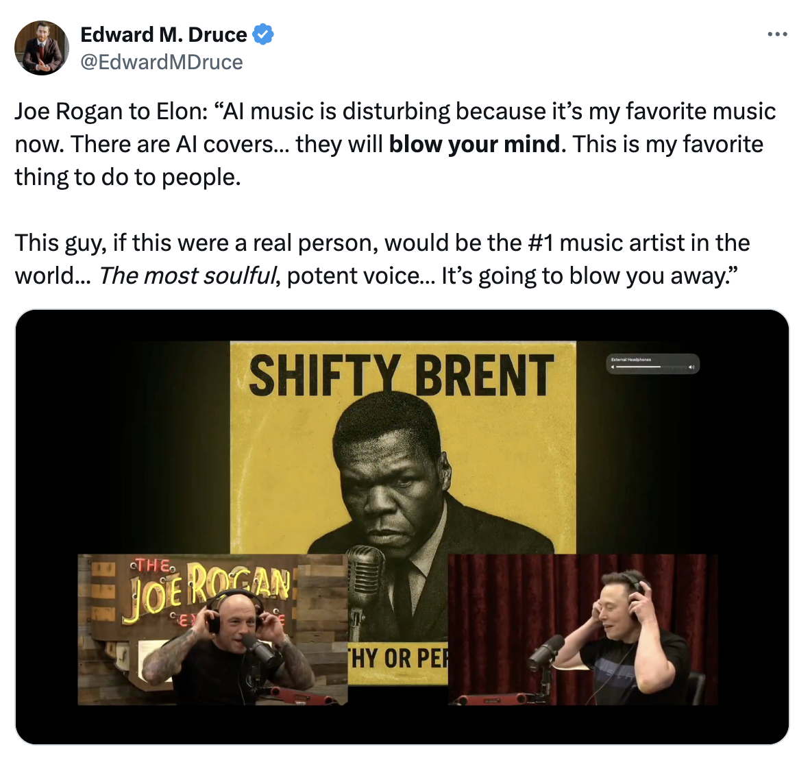 In 2015, when Schmidt and I spoke, Spotify had only been active in the U.S. market for four years, but the writing was already on the wall. Today, their capture of the U.S. music market is nearly complete. Because streaming now accounts for 84% of total music industry revenue—and Spotify is the clear winner amongst streaming platforms—it's no exaggeration to say that for many consumers, the notion of listening to music without Spotify simply doesn't exist. No matter how esoteric or off-beat, artists must now compete for listener real estate with the likes of Joe Rogan podcasts and fake machine-generated slop created by startups.