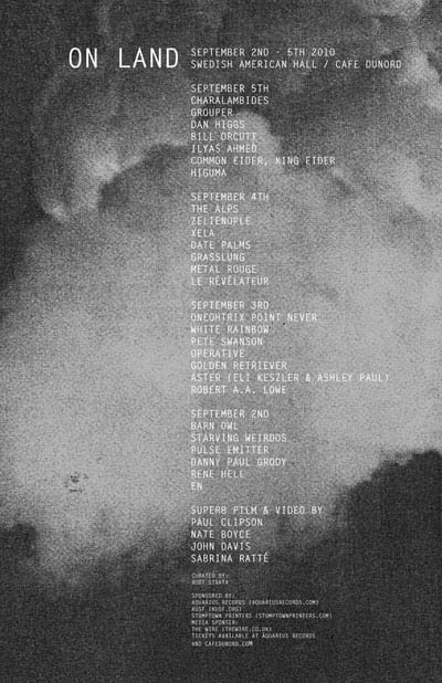And if you look at the two lineups for the On Land festivals, which were 2009 and 2010, both of those were a mix. There were some acts that I would say were straight up 'ambient'—but I think it was a wide range of stuff. I think it was more an ethos we all shared than it was the specific kind of music we played, if that makes sense. It felt more kind of like we had some commonality around our experience, or the way we wanted to make music, or just the DIY aesthetic and doing things on our own.
